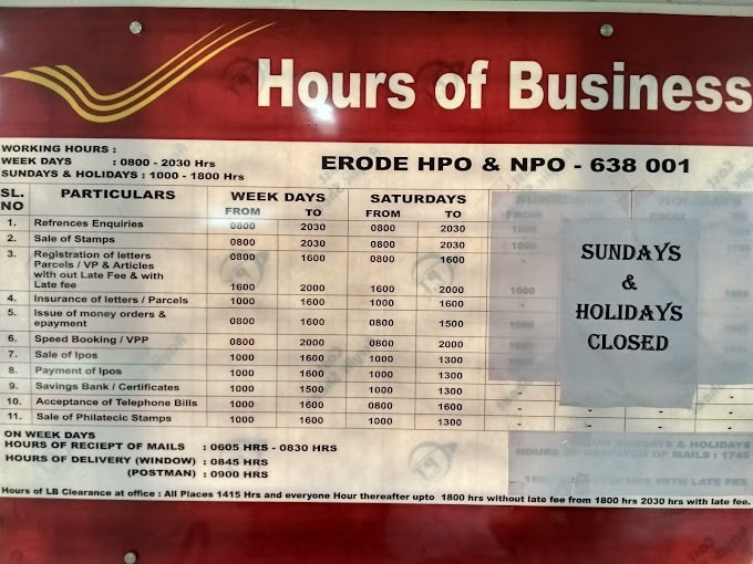 Erode head post office phone number, Erode head post office address, Erode head post office timings, Erode Head Post office photos, Erode Post Office list, Erode Collectorate Post Office phone Number, Erode Post Office Job Vacancy, Erode Surampatti Post Office phone Number